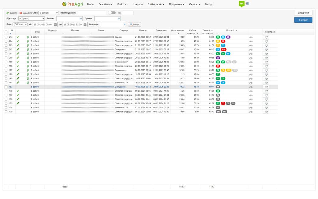 Machines and equipment reports on downtime, moving and field work